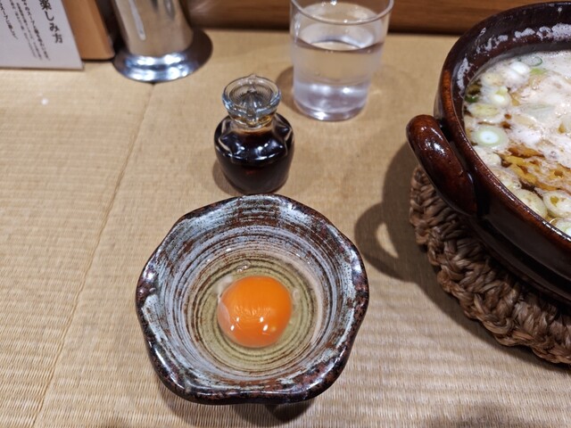 〆のご飯に、追い卵と鍋焼きラーメンの半熟玉子のW玉子おじや。親鶏とちくわにラーメンスープを加え、旨味倍増の美味しさ(笑)!!