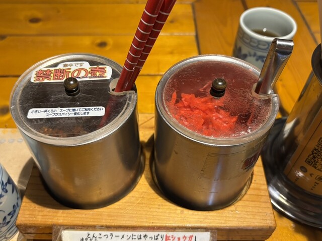 テーブル上には、紅生姜の他に禁断の壺と書かれた中には辛子高菜かな?にらも入ってそうだけど。
