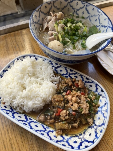日替わりランチメニューはかなり豊富で迷う方が多いけどわたしは毎回一択。クイテイアオとガパオライス。