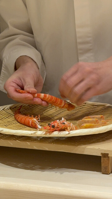 大きな大きな車海老をその場で剥いて握ってくださる海老は、肉厚でプリプリ♡