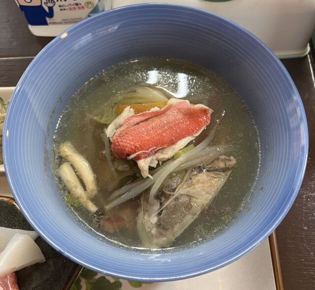 お椀は、濃厚なアラ汁に野菜などの具を入れたモノです