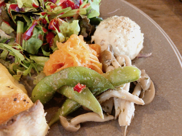 ベリーの自家製ドレッシングにオレンジが香るキャロットラぺ、枝豆にきのこにポテトサラダ、めちゃめちゃ美味し~い٩(๑>◡<๑)۶