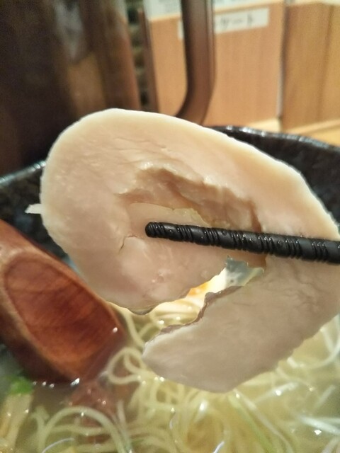 鶏チャーシュー。鶏ハムと言うべきでしょうか。シソの葉が巻き込んであります。ぱさつきは一切なく、脂も皮もありませんが、ジューシーです。ハムのような風味と、僅かな塩味があって、とにかくうまい。