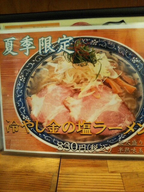 もう一品、家内がお願いした冷やし金の塩ラーメンは、もはや中村商店さんでは、すでに夏の定番ですね。冷やし中華ではない、出汁が張られた冷たいラーメンです。清湯で出汁の旨味ががっちり効いていて、それでいて冷たくて麺のコシもしっかり。更にはやはりチャーシューが抜群に美味しい。冷たくても肉の脂の美味さが楽しめる極上のチャーシュー。きりりと冷えたスープがごくごく飲めて大満足です。金の塩というネーミングに相応しく最上級の輝きを持つ一杯です。