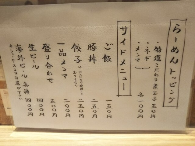チャーシューは、厚いの1枚か、薄いの1枚と煮玉子か、選べます。私は、薄いの1枚と煮玉子を選択。メンマは、厚いの2本か、薄いの4本か、選べます。私は、厚いの2本を選択。