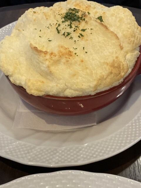 ふわふわスフレの中にはホワイトソースと厚切りベーコン、しめじ、そしてケチャップライスが入っていて、口に入れるとスフレが泡のように溶けてトマトソースがめっちゃからまってて、お!、二重奏...