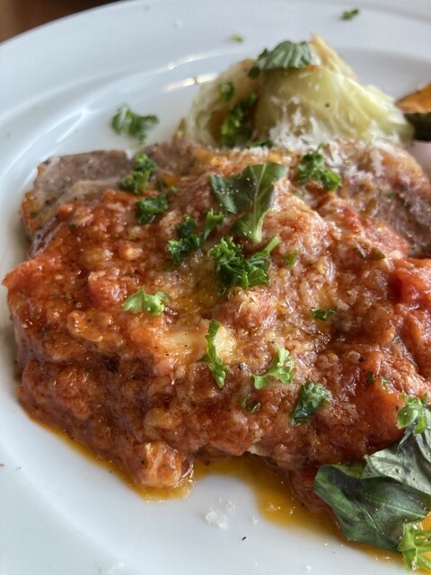 癖になりそな、旨みのあるソースですね!初訪問で2階へと!ラッキー!梁が剥き出しのお洒落な空間!程なくしてサラダがやってきました♪いよいよ日替わりランチは豚ロースグリルの登場です♪待ってたよ♪トマトソースを焼き野菜にも絡めて!やわらかいロース肉とハーブをこうやってソースに絡めてさ!うまい♪トマトソースがホントに好きなんだよな、俺!