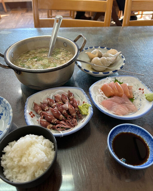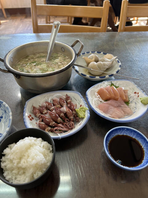 ホタルイカ、バイ貝、ざすと鯛の刺身、たら汁をチョイス。