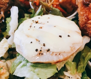 生野菜の上に大根が乗っています。大根は温かくマヨネーズと一緒に焼いたのだと思います。