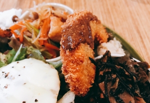 一口食べた時あまりにも美味しくて、これなんだろう?と食べても食べても分からなくて、店員さんに聞いたら車麩のフライだそうです。