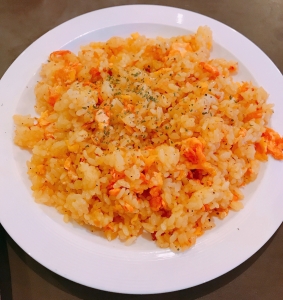 ガーリックの入っている炒飯ね!とタカをくくっていたら、想像していたのと違う(*゜Q゜*)美味しい♪♪何が違うの?とよく見たらオレンジの物体が・・・シャケ!!