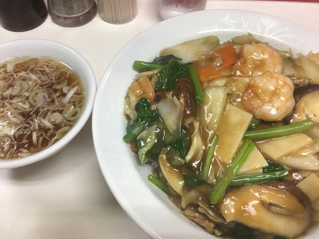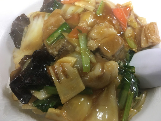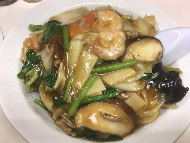 豚肉、エビ、イカ、白菜、シイタケ、舞茸が入っており、三大旨味の成分の相乗効果とはこういうものかと納得してしまいます。さらに先程の食材プラス、木耳、筍、青菜?の食感がとても楽しく頂け、大満足の一皿(850円)です。