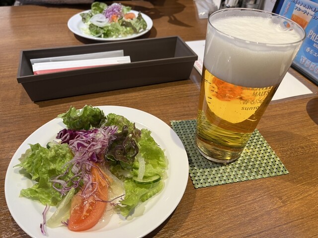 注文して数分で、まずサラダが到着。シャキシャキとした新鮮な野菜の上に自家製の酸味が効いたドレッシングがかけられています。