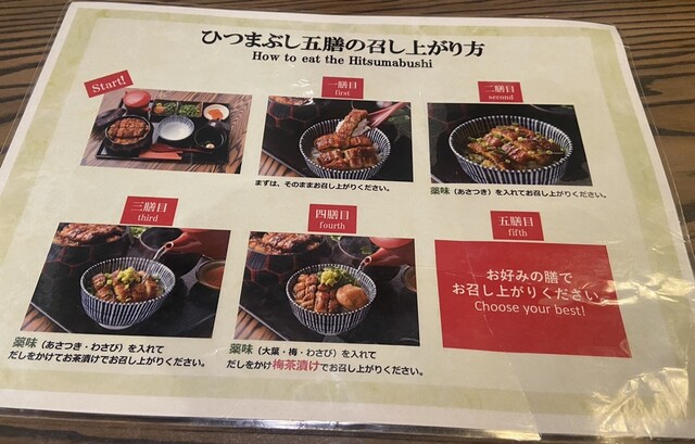 本当に15分くらい待ちで入店でき、時間がなかったこともありうなぎ1/2量の小花にする。人生2度目の名古屋でのひつまぶし。カリッと焼かれていて濃過ぎたり甘過ぎたりしなくて美味しい!!