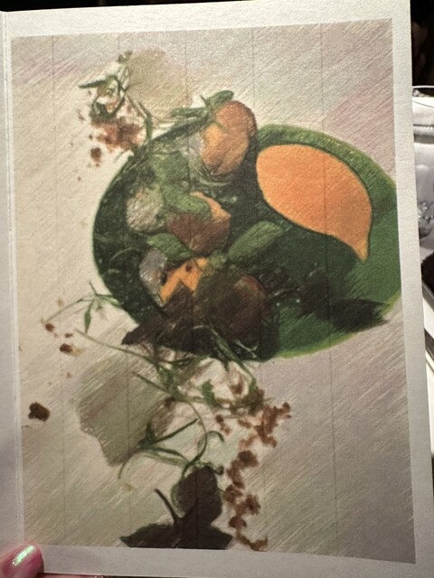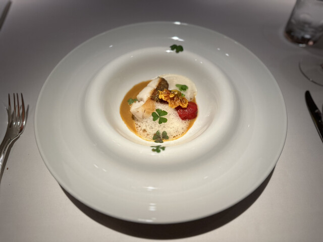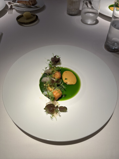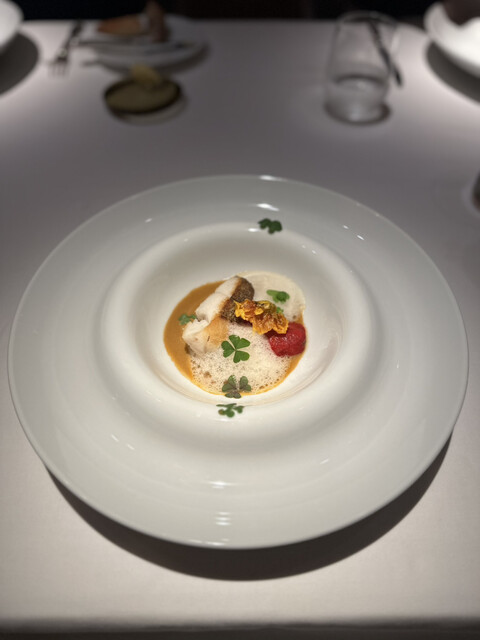 冬よりも肉厚のよう!生ハムのエキスから作ったカプチーノの泡!ナスタチウムを揚げたもの。