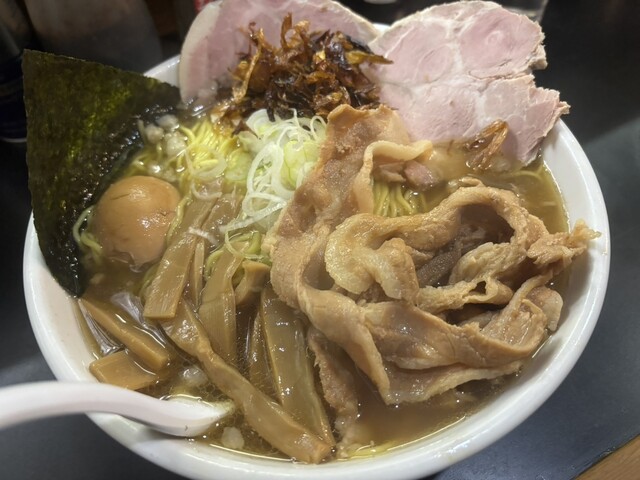 煮干しの塩味がガンガンと効いたスープだが臭みはなし。
