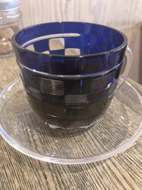 コーヒーゼリーにコーヒーソフトがのったものは、ゼリーがここまでコーヒーの風味が強いのは初めてなくらい美味しかったですし、深煎りのコーヒーは雑味なく苦さが強く酸味が少ない好みのど真ん中!しかも素敵な江戸切子、今回はブルーの市松模様も最高でした