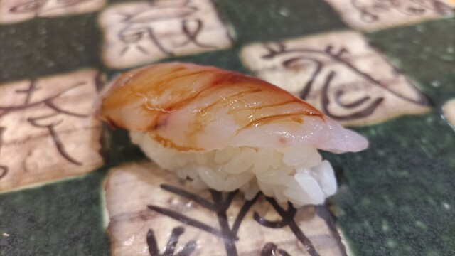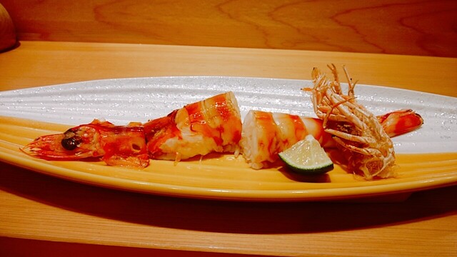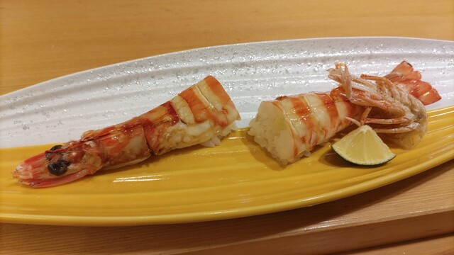 大車海老の姿鮨は、調理してこの大きさは、ビックリ!! 調理前の生の大きさはどの位なのかが気になります(笑)