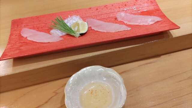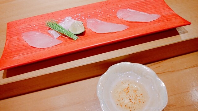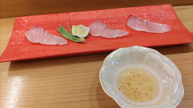 カレイの薄造りは、縁側の大きさからすると相当な大物だと思います。身の味は、淡白ですが繊細、縁側は程よい脂がのっていて、とてもバランスよく感じます。