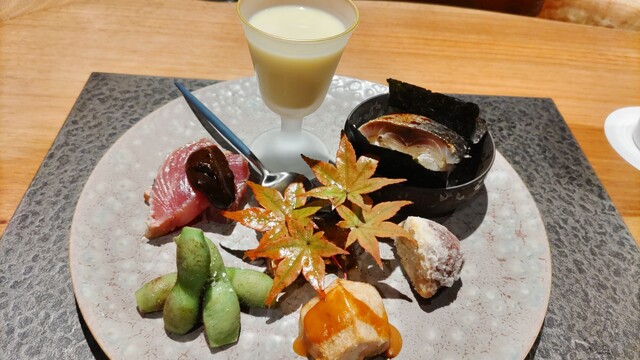 八寸は、お皿に秋が詰まっていて、見た目の奇麗さ、味わい、ボリュームとも大満足の逸品です。