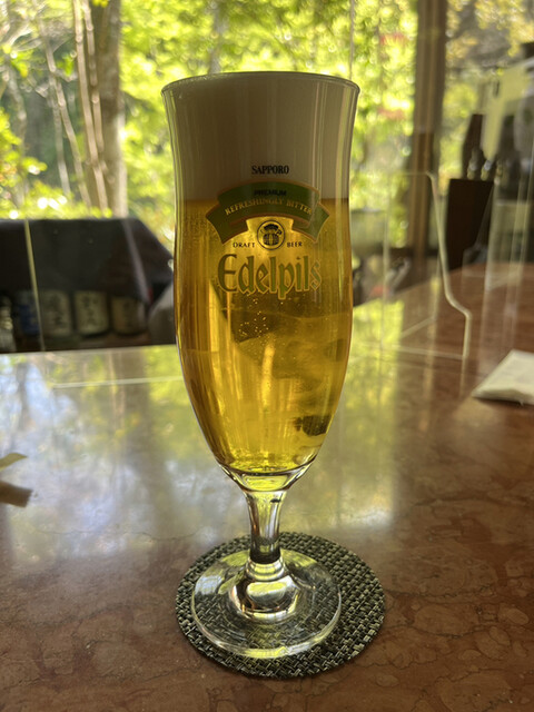 吉兆出身の料理長がお料理を奏でる山荘天水に入るバー。チェックイン前に利用。サッポロビールと言えばエーデルピルスなかなか置いているお店が少ないここ銘柄がサーバーから3度注ぎでグラスへ注がれる。この山の中の環境で飲めるのは有り難い。