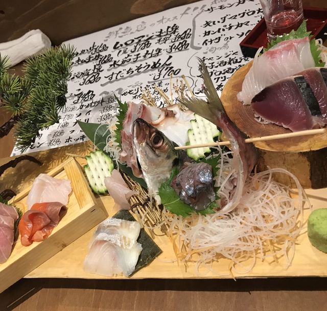 2人分のお造り、1280円。鯛、はまち、タコ、まぐろ、サーモン、鯵、鰹、だったかな。