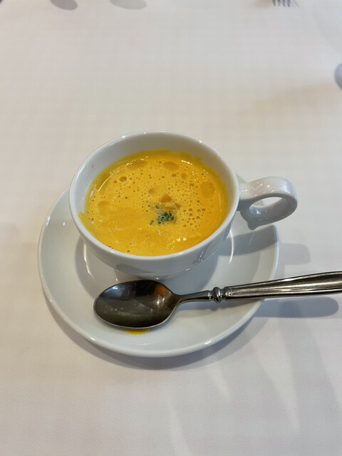 バターナッツカボチャのポタージュは丁寧な仕上げでコクがあって、たまらない甘さと何より熱々で提供されて絶品です。