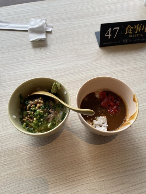 アジのなめろうに熱々のお出汁をかけて頂くお茶漬けは絶品、何気に味見のビーフカレーもgoodです。