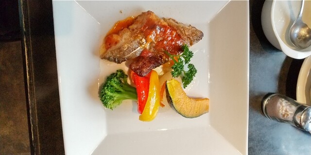 お魚料理は鱈のトマト味で付け合わせの野菜と共に美味しく頂きました。