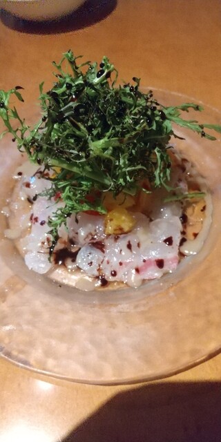 イチオシは、鮮魚のカルパッチョです。上の香草を取り除くと、色鮮やかなフルーツが顔を出し、鮮魚を引き立てます。見て楽しく食べて美味しく、是非とも.お薦めしたい一品です (^o^)/