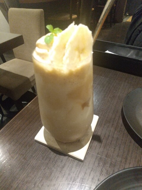 ・濃厚バナナムースにラム風味のムースとエスプレッソを合わせてシェイク。トッピングは自家製ラムレーズンアイス。リッチで大人の味わい。