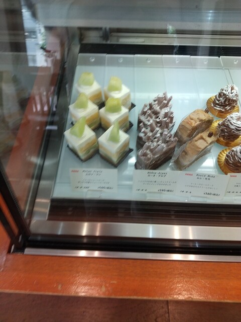 お店自体はやや小さく、街のケーキ屋さんといった感じ。やや狭いがカフェコーナーあり(2人掛けのテーブル卓が4卓)