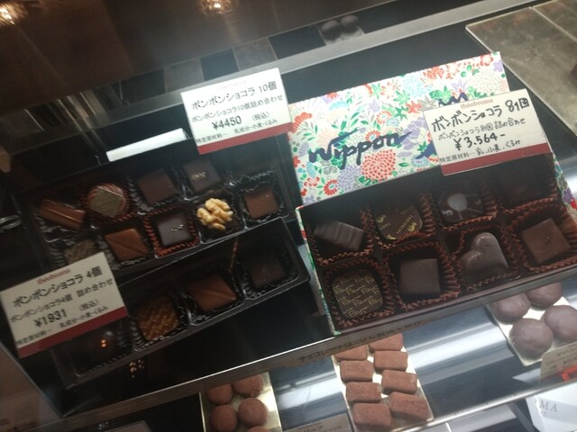 チョコレートが看板商品のようで、テイクアウト用のテリーヌやマカロン、チョコレートが売っている。焼き菓子もあり。
