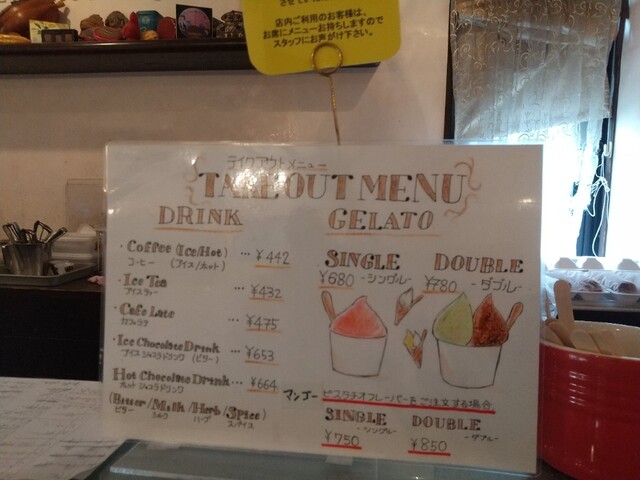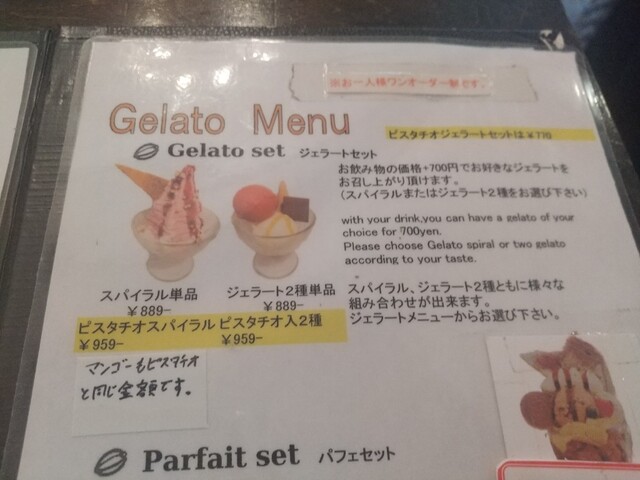 カフェメニューはジェラート以外にケーキやパフェもあり。すでにピスタチオジェラートとパフェが売り切れ。