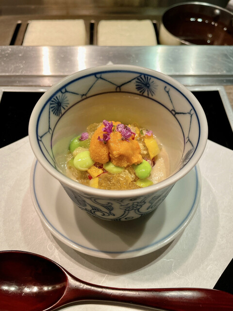 シャーベット状の出汁凍りが入っていて、程よい辛味と爽やかな舌触りの野菜で口の中をリセット。