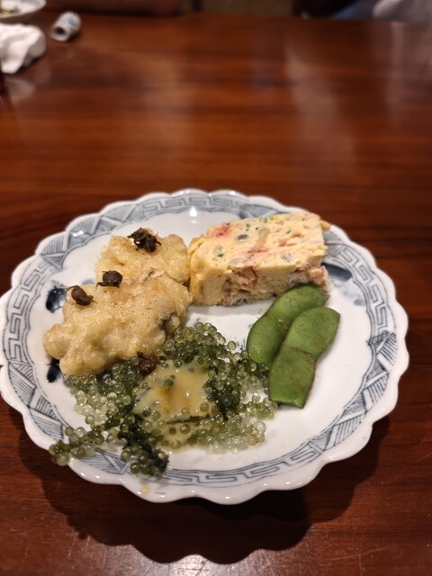 手前から海ぶどうのパッションフルーツソース、鰻天ぷら、卵焼き、枝豆