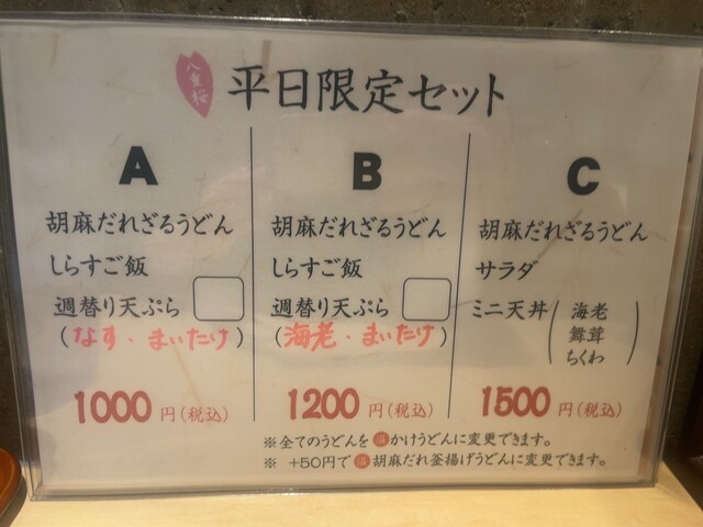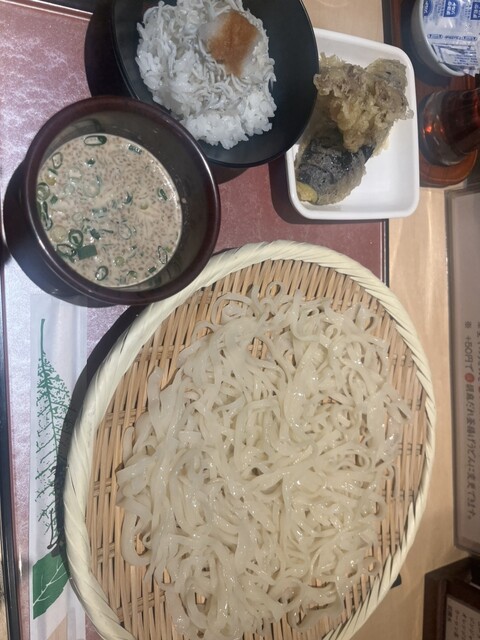 平日11:30開店で11:25到着。既にお一人並んでいました。店内は清潔で1人の客が多いからかカウンターが多いです。平日ランチのAセット天ぷらは舞茸と茄子でした!ざるで提供されるうどん、テンション上がる。うどんは冷たくていくらでもツルッといけます。天ぷらの衣はざくざくでナスはジュワーと口に広がります。天ぷらのあとのしらす丼がちょうどいい。最後はラー油で味変して完食!ごまだれうまい。また食べたい。