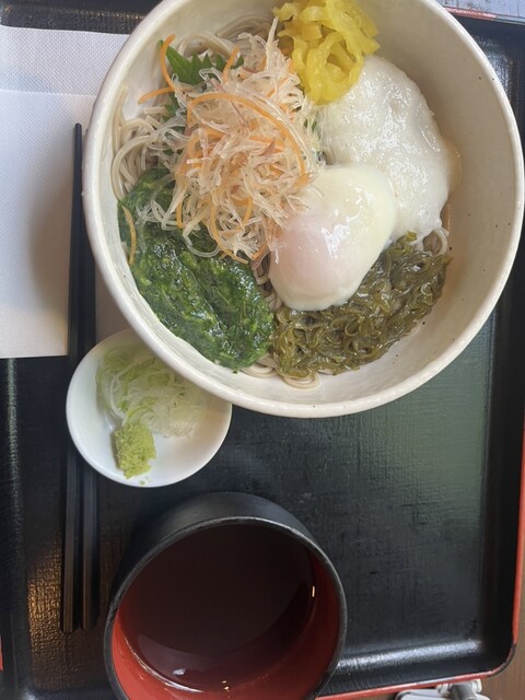 8月平日14時来店。畳座席で風鈴の音を聞きながら『夏の元気蕎麦』をいただきました!めかぶ、茗荷、とろろ、温泉たまご薬味がたくさんのってて最高!蕎麦はしっかり冷えててコシがあります。暑い日にぴったりでリピートしました。メニューにあるうちはまた頼みたい。