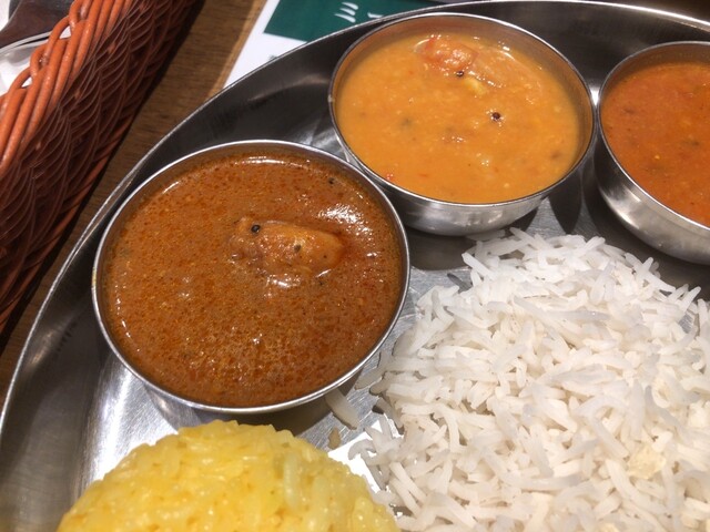 程なくして「ランチミールス」(1,240円)が登場です。1種類選べるカレーはエリックチキンカレーを。豆カレー、サンバル、ラッサム、ヨーグルトにパパド。ライスはターメリックとバスマティと色彩豊かなプレートです。