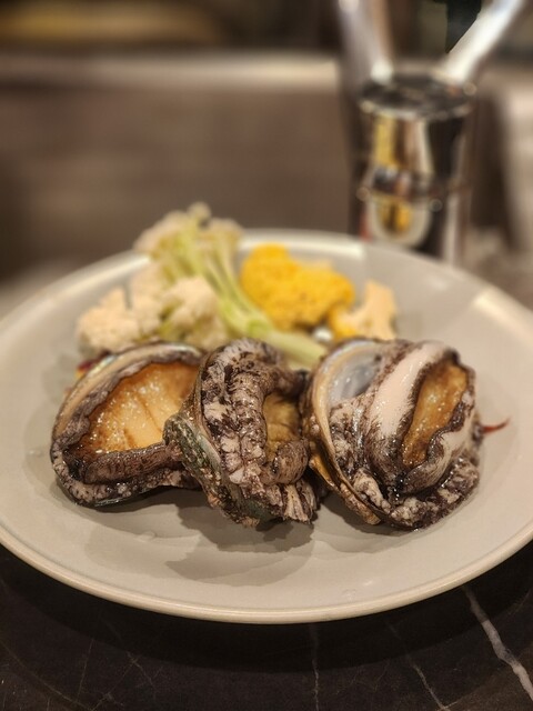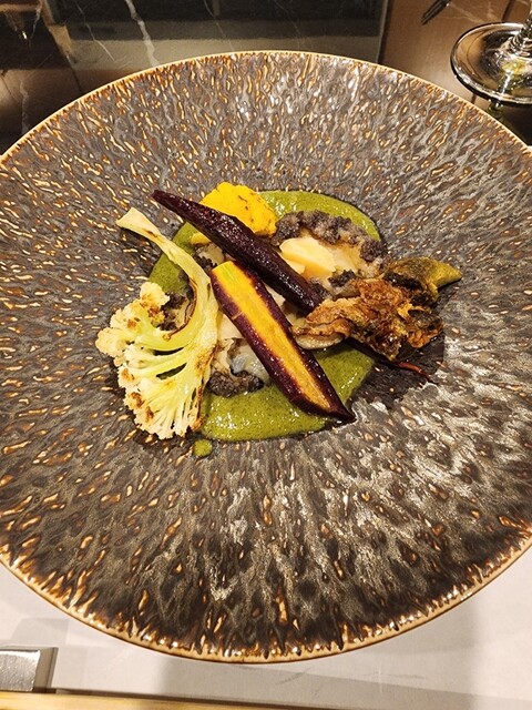 最初焼き蓮根と海老の入った揚げ物から始まりました。こちらは、最初から揚げ物?と思いましたが、プリッとした海老がいて、サクッとした蓮根でさっぱりします。毎度これではないかもしれませんが、甲殻類アレルギーの方は先に伝えた方が良いです。