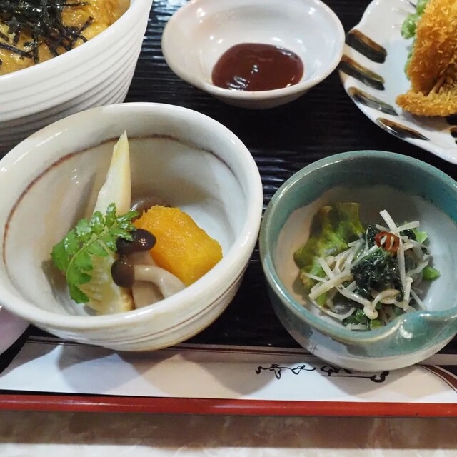 (南瓜の片栗粉固め、赤大根の煮付け、筍、昆布の佃煮)