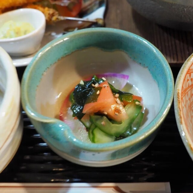 海老フライ串・鶏つくねフライ串のアボカドソース&あさり稲庭うどん 炊き合わせ キュウリ、トマト、ワカメの酢の物…