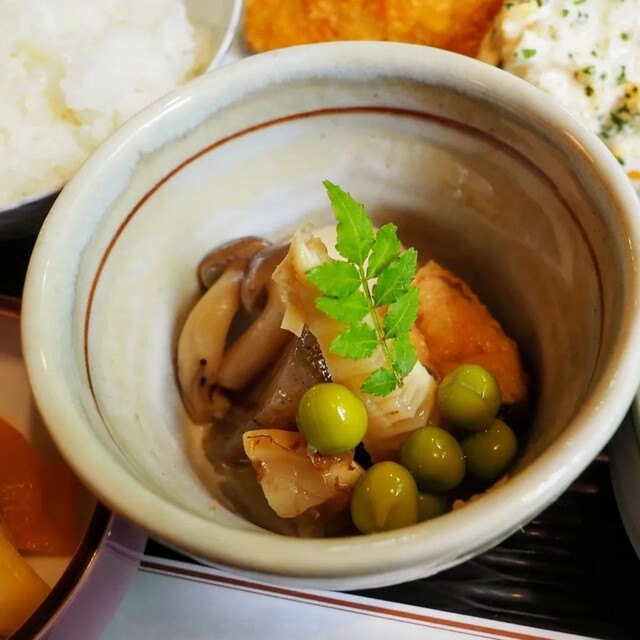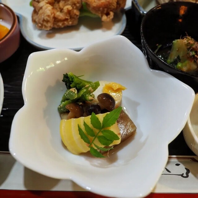 なめこおろし蕎麦&トビウオ・茄子・木の芽の天ぷら 炊き合わせ&いんげんの味噌和え