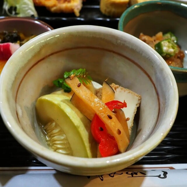 (茄子の煮浸し、サヤエンドウ、示し、人参、南瓜)
