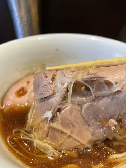 豚チャーシューのうちの2枚はおそらく肩ロースの部位、肉厚で柔らかく、備長炭の炭火で焼いた事で綺麗に脂が溶けて、肉の旨味か凝縮。めちゃくちゃ美味しい。