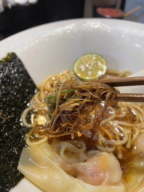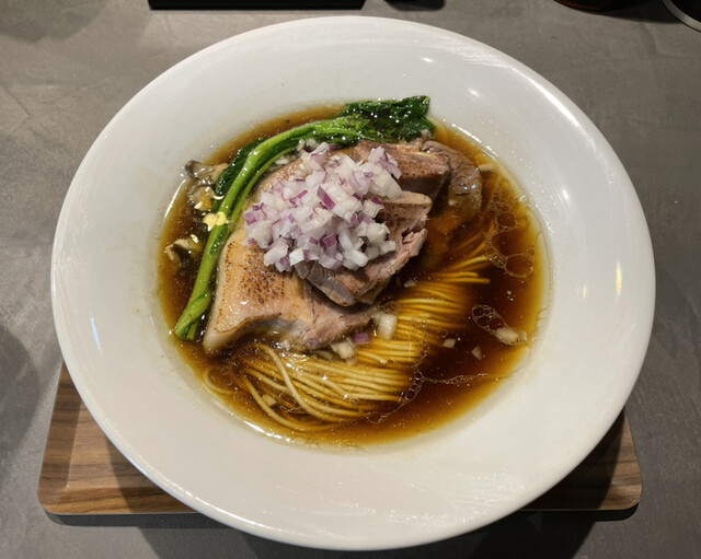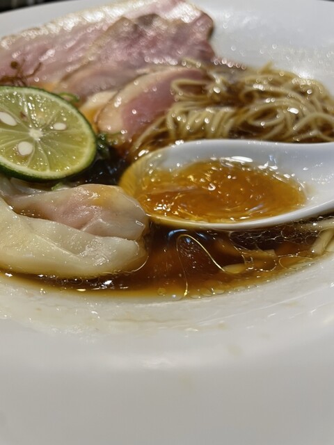 香り豊かな深みのある澄んだ琥珀色のスープに、店主が柴崎亭で会得した美しく整えられた麺、低温チャーシュー、豚肩ロース、鶏胸肉、鴨ロース、ワンタン、九条ネギ、に海苔が添えられ、トップにはネギ、フライドエノキが飾られています。