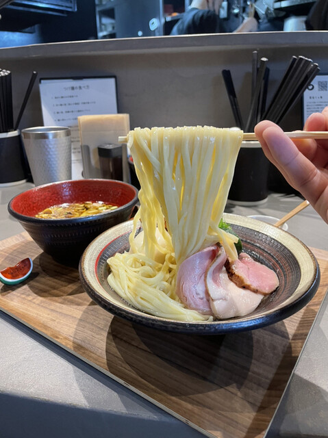 スープはつけ麺という事もありアタックやや強め、地鶏ベースに羅臼昆布などで旨味を補強したものとなっていて、それに天草大王の脂を加熱して抽出した香り豊かなでコクのある鶏油が加わる事で唯一無二の味わいに。昆布水に浸っていた麺をつけて食べると爽やかさが増してバランスが整います。
