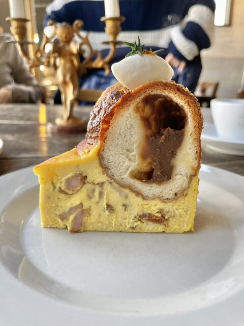 フランスでバハオラム(ブリオッシュチーズにラム酒をたっぷり染み込ませたデザート)を見た事でインスパイアされたこちら。フランスノルマンディー地方のカルバドス(りんごの蒸留酒)粘度のある食感の酸味あるレアチーズケーキにカルヴァドスが染み込んだ?りんごがちらほら散りばめられて、チーズケーキに埋め込まれたクロワッサンとの相性が素晴らしく悶絶。