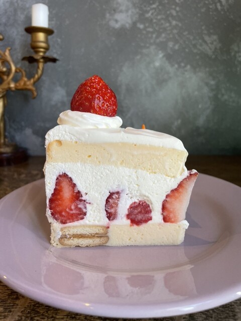 ショートケーキチーズケーキは、ショートケーキのスポンジの部分がチーズケーキになっていて、さっぱりとした甘味のクリームに濃厚なチーズケーキ、惜しみなく使われた大きなイチゴのジューシーな酸味が味わいを引き締めます。