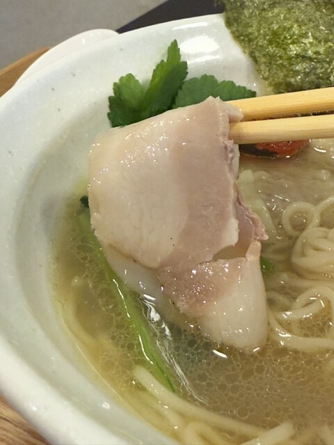 豚肩ロースチャーシューは、薄くスライスされており、赤身の充実した旨味に、ほんのりと脂身のコクが溶け込んでいます。